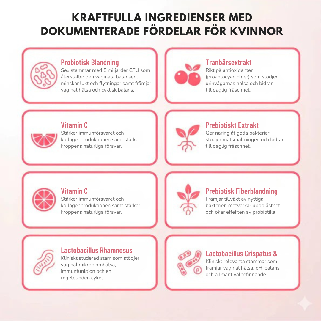 De innehåller kliniskt testade probiotika och naturlig kraft från tranbär, som tillsammans hjälper till att återställa goda bakterier, bekämpa skadliga ämnen och skydda mot återkommande obehag.